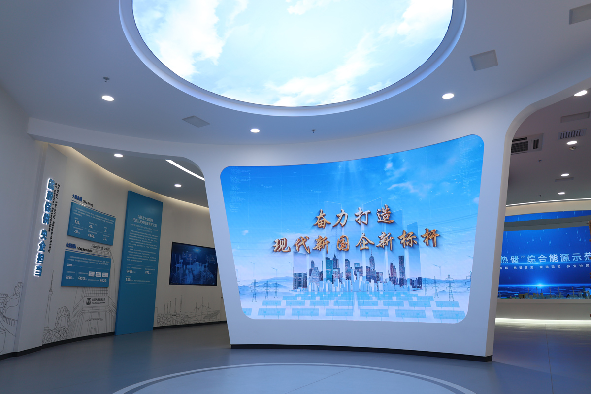 ????全廳共分為公司形象、發展歷程、領導關懷、產業布局、智慧沙盤、科技創新、業績貢獻、黨建引領、未來藍圖、企業榮譽十大主要板塊。應用多點交互、跨屏互動、數字沙盤、矩陣滑軌等智慧技術,實現長屏一覽、地屏光影、合屏沖擊等數字展示新形式,讓參觀者能夠“沉浸式”領略千萬千瓦級“風光火熱儲”綜合能源示范基地的過去、現在及未來。