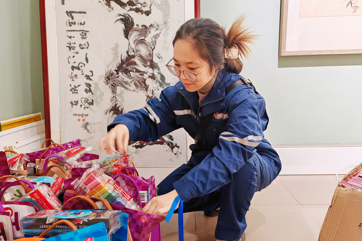 志愿者們提前抵達活動現場,協助完成場地布置工作。在引導愛心人士入場時,志愿者們不僅為來賓辦理簽到登記,還為每位參與者佩戴象征關愛的藍絲帶。活動中,志愿者們還為孩子們精心準備了繪畫工具套裝、文具禮盒、手工黏土、彩色卡紙等獎品,將大唐青年的關懷傳遞到每個角落。