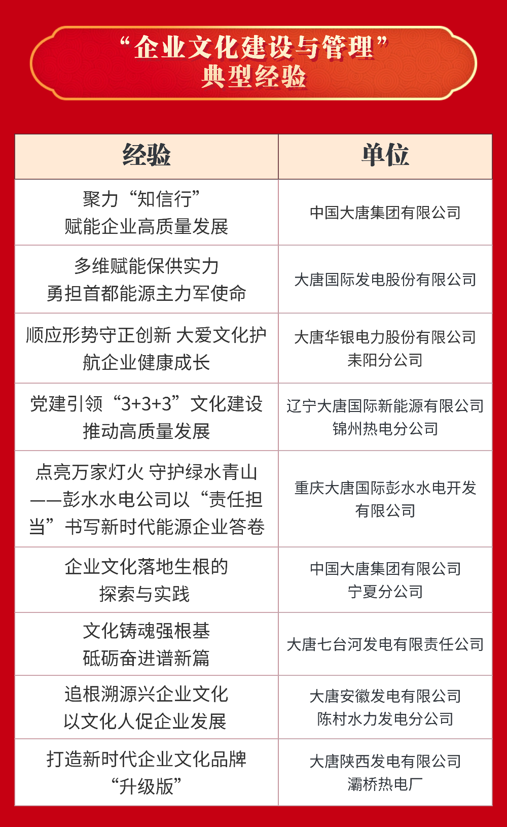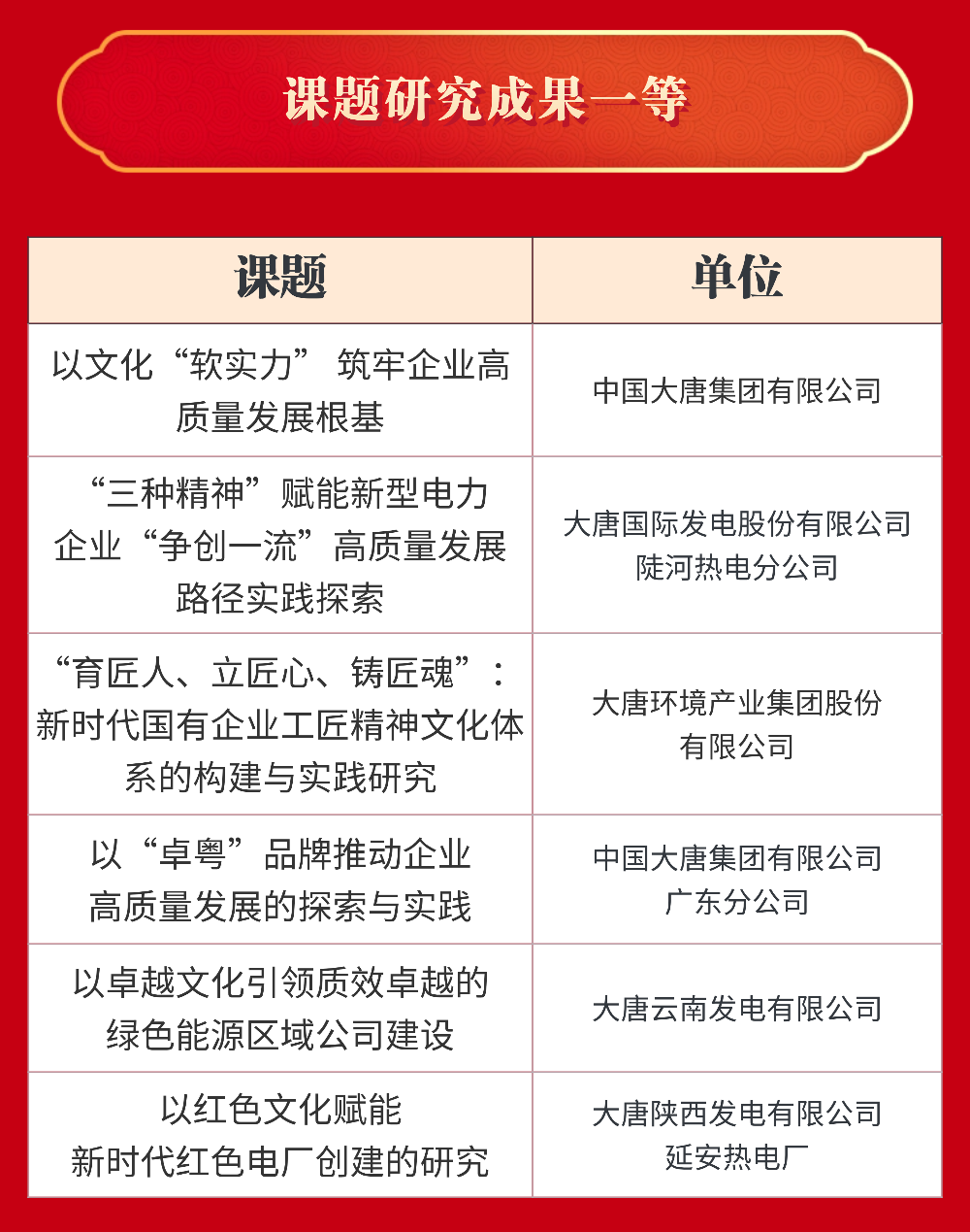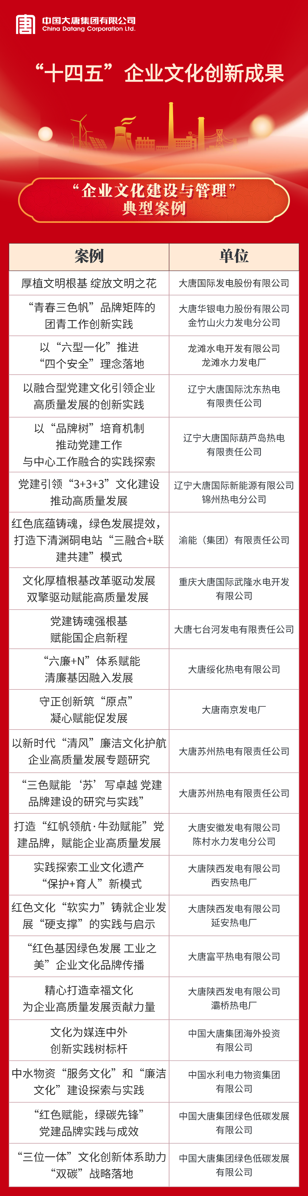 近期,中國企業(yè)文化研究會在第二十二屆中外企業(yè)文化峰會上發(fā)布了“十四五”企業(yè)文化建設與管理創(chuàng)新成果和2025年度企業(yè)文化課題研究成果,中國大唐集團有限公司及系統(tǒng)單位斬獲多項榮譽。