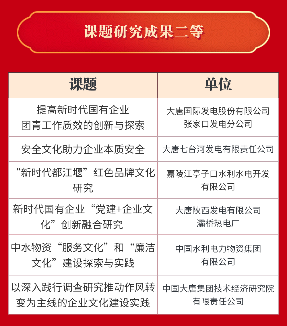 大唐國際發(fā)電股份有限公司等22家單位獲評“十四五”企業(yè)文化建設與管理典型案例;中國大唐及所屬8家單位獲評“十四五”企業(yè)文化建設與管理典型經(jīng)驗;中國大唐及所屬5家單位獲評課題研究成果一等;大唐國際發(fā)電股份有限公司張家口發(fā)電分公司等6家單位獲評課題研究成果二等。具體名單如下: