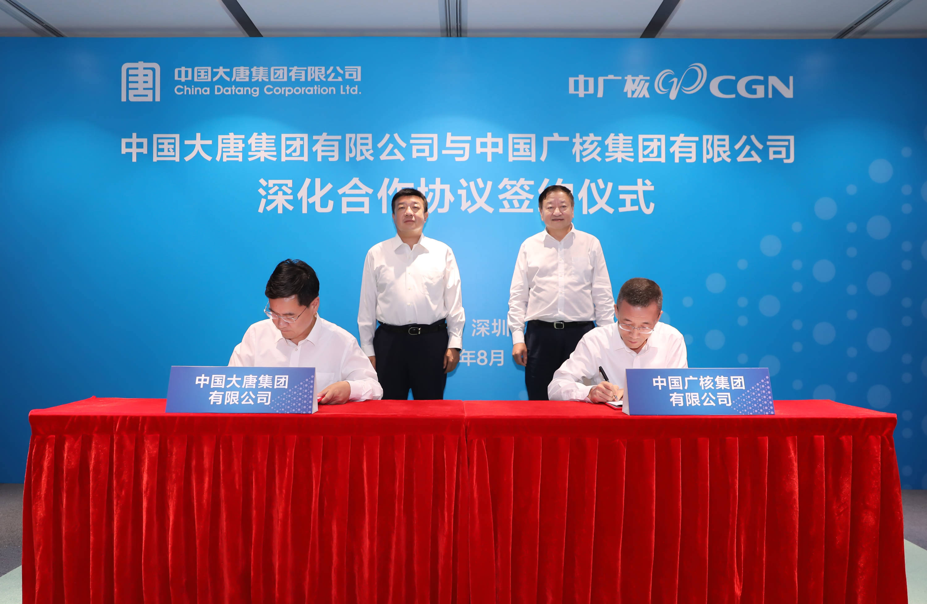 本網訊 8月6日,中國大唐集團有限公司與中國廣核集團有限公司在深圳簽署深化合作協議。簽約前,中國大唐黨組書記、董事長呂軍與中廣核黨委書記、董事長楊長利圍繞核能、新能源、國際業務合作等進行深入座談交流。
