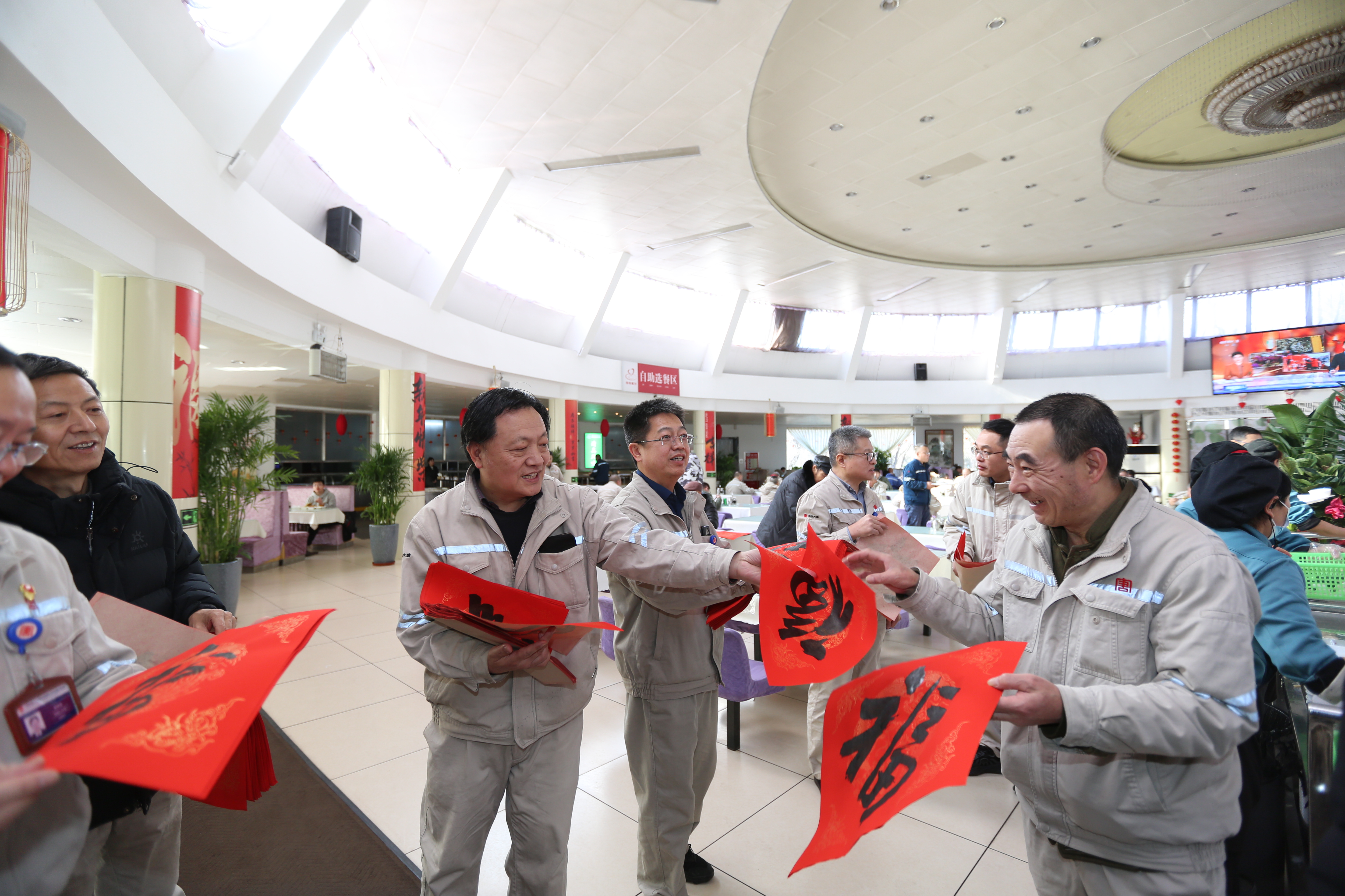 職工餐廳里,一場別開生面的送福字活動在新春的序曲中溫馨啟幕,活動現場,書法協會書法愛好者們齊聚一堂,紅氈鋪展,墨香縈繞,只見他們筆走龍蛇,力透紙背。一個個“福”字,或飄逸靈動,如行云流水;或剛勁有力,似蒼松挺立,每一筆,都飽含著對新年的美好祈愿。前來領取福字的員工們,眼中滿是對新年的欣喜與期待。