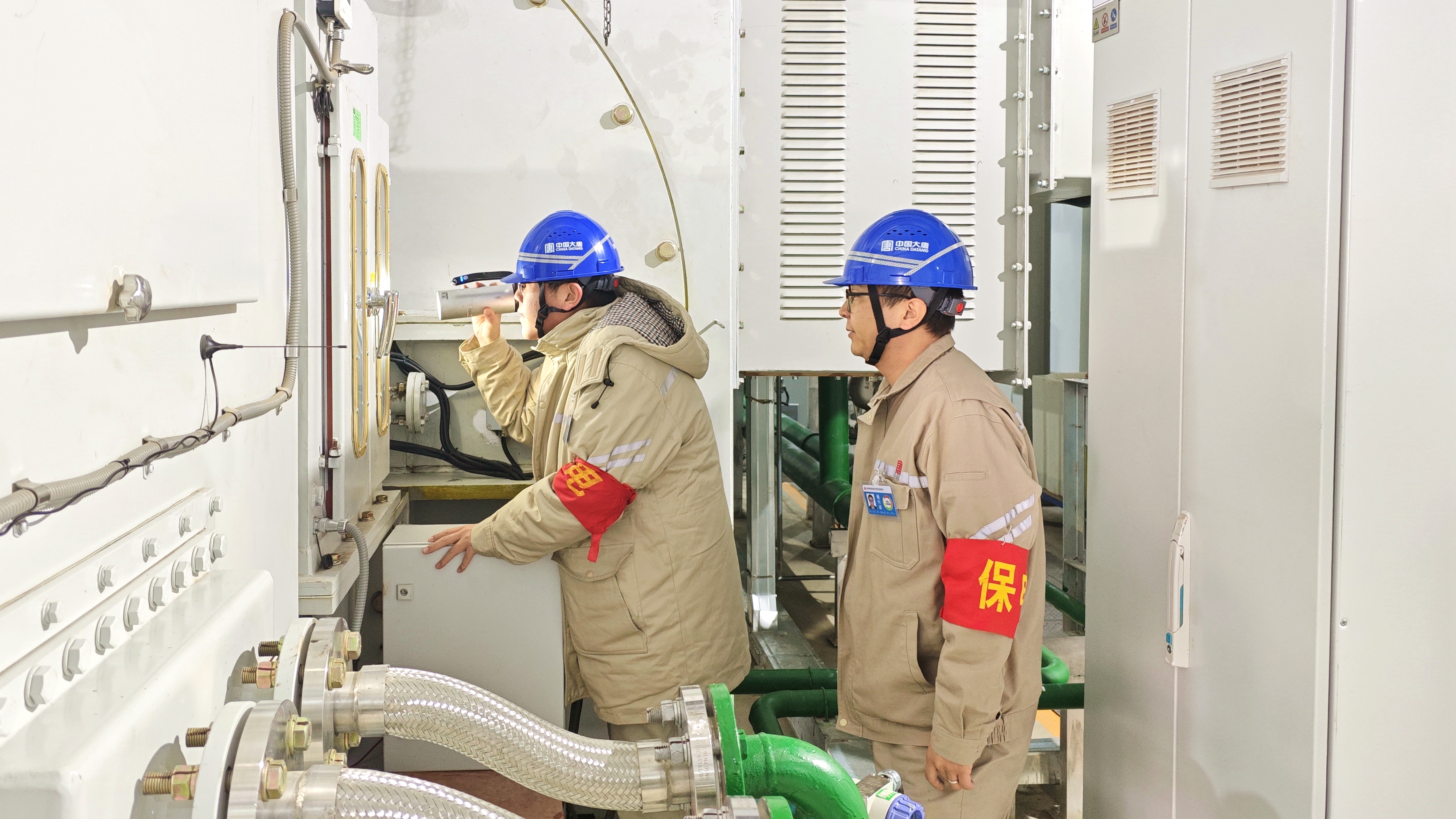隨后,倆人沿著錯(cuò)綜復(fù)雜的冷卻水管路檢查。薛立波蹲下身子,仔細(xì)觀察水管的連接處,用手電筒照亮每一個(gè)縫隙,查看是否有滲漏跡象。侯杰則在一旁用測(cè)溫槍測(cè)量水管表面溫度。