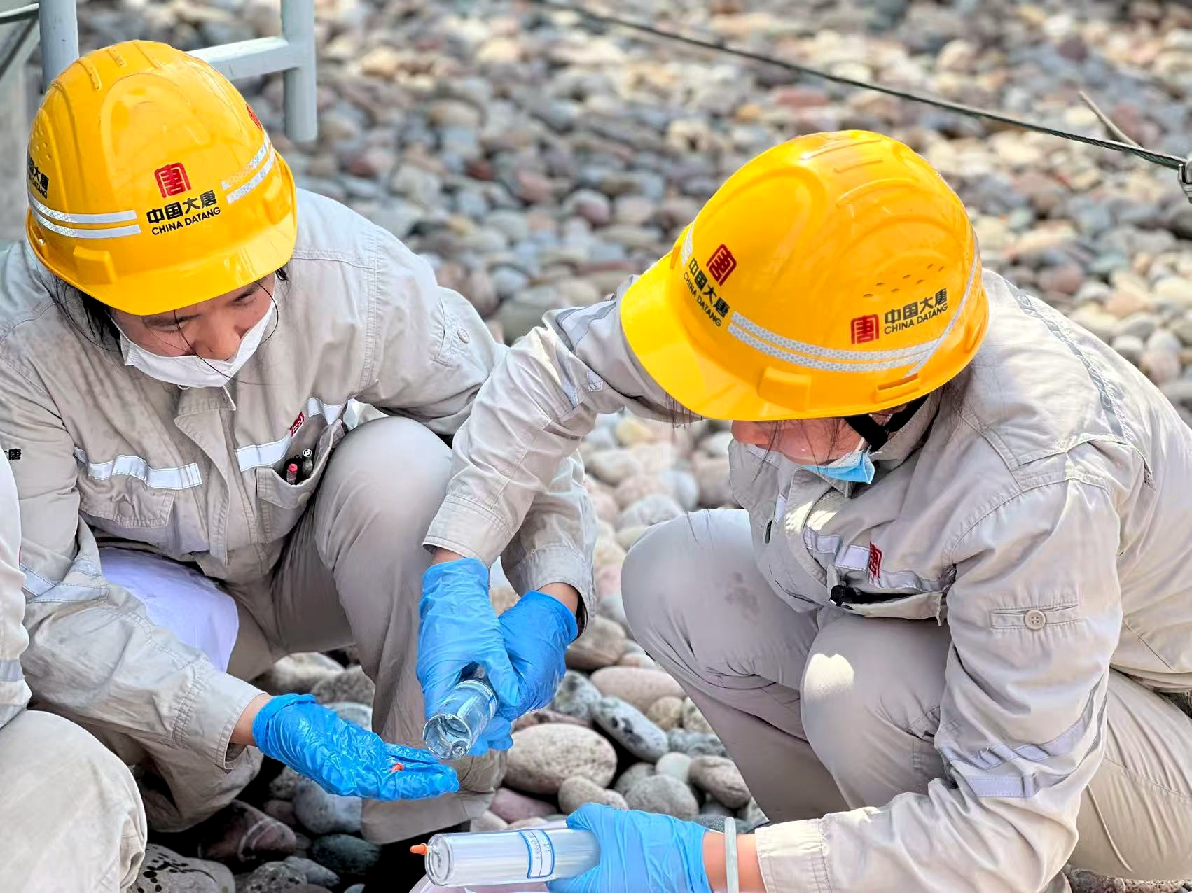 4位身著工裝的“娘子軍”手提取樣瓶,穿梭在設備之間——有人手里攥著棉布,隨時準備擦拭取樣瓶;有人護著裝滿油樣的取樣瓶,生怕被陽光直射影響樣品質量。盡管臉龐被曬得通紅,汗水在安全帽帶下匯成細流往下淌,但遞工具、接樣品、擦瓶身、封瓶口的動作,始終有條不紊、一絲不亂。