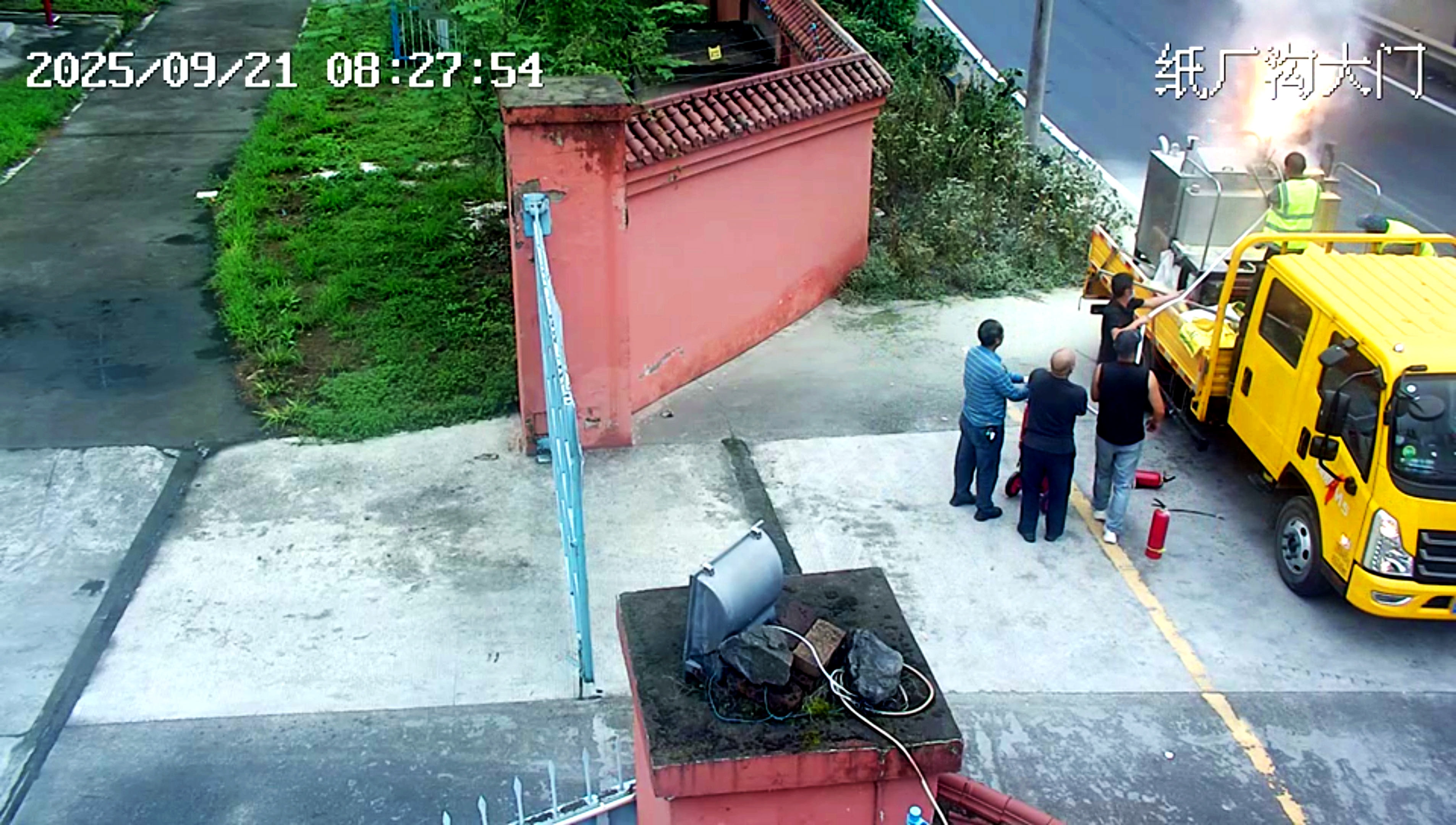 9月21日8點21分,該公司紙廠溝庫房大門前的馬路上,一輛正在執(zhí)行道路劃線作業(yè)的工程車突然燃起熊熊大火。火勢迅速擴大,情況異常危急,車輛作業(yè)人員立即向距離最近的紙廠溝庫房值班人員發(fā)出求救信號。