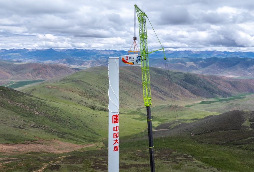 7月10日,在藏東南高原,隨著現場指揮員一聲令下,1800噸汽車吊將重達117噸的風機葉輪組件緩緩吊至110米高空與機艙精準對接,標志著世界在建最高海拔風電場——大唐西藏能源開發有限公司八宿100兆瓦保障性并網風電項目首臺風機吊裝作業順利完成,實現了中國大唐在藏風電工程建設從無到有的跨越式發展,也為雪域高原增添了又一綠色能源新地標。