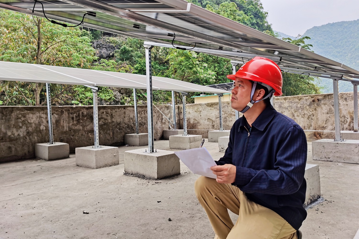 駐村工作隊(duì)與施工單位人員正在查看光伏板安全情況