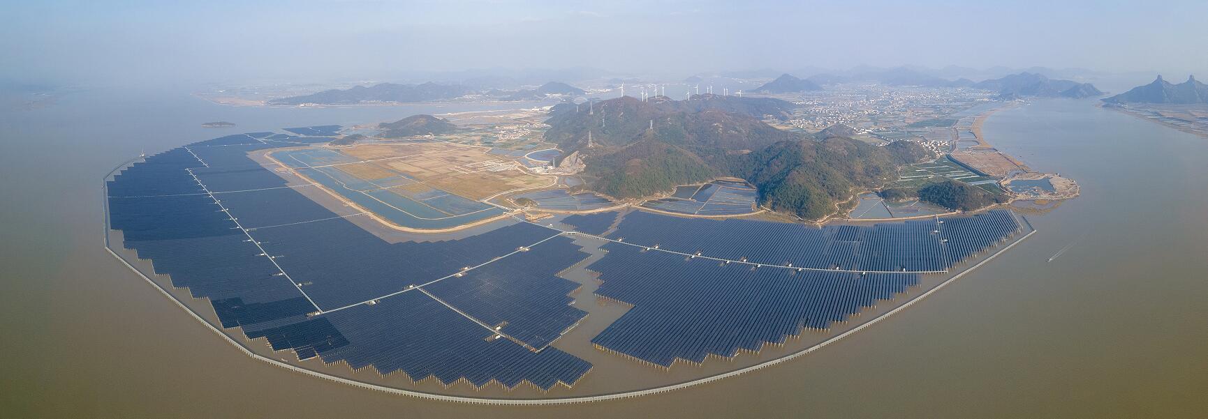 東海之濱象山縣高塘島鄉,國內首個大型海岸外灘涂光伏電站--長大涂光伏電站--;60多萬塊光伏組件在陽光下熠熠生輝。該電站每年可生產清潔能源2.9億千瓦時,減排二氧化碳24萬噸,相當于種植13萬顆樹。