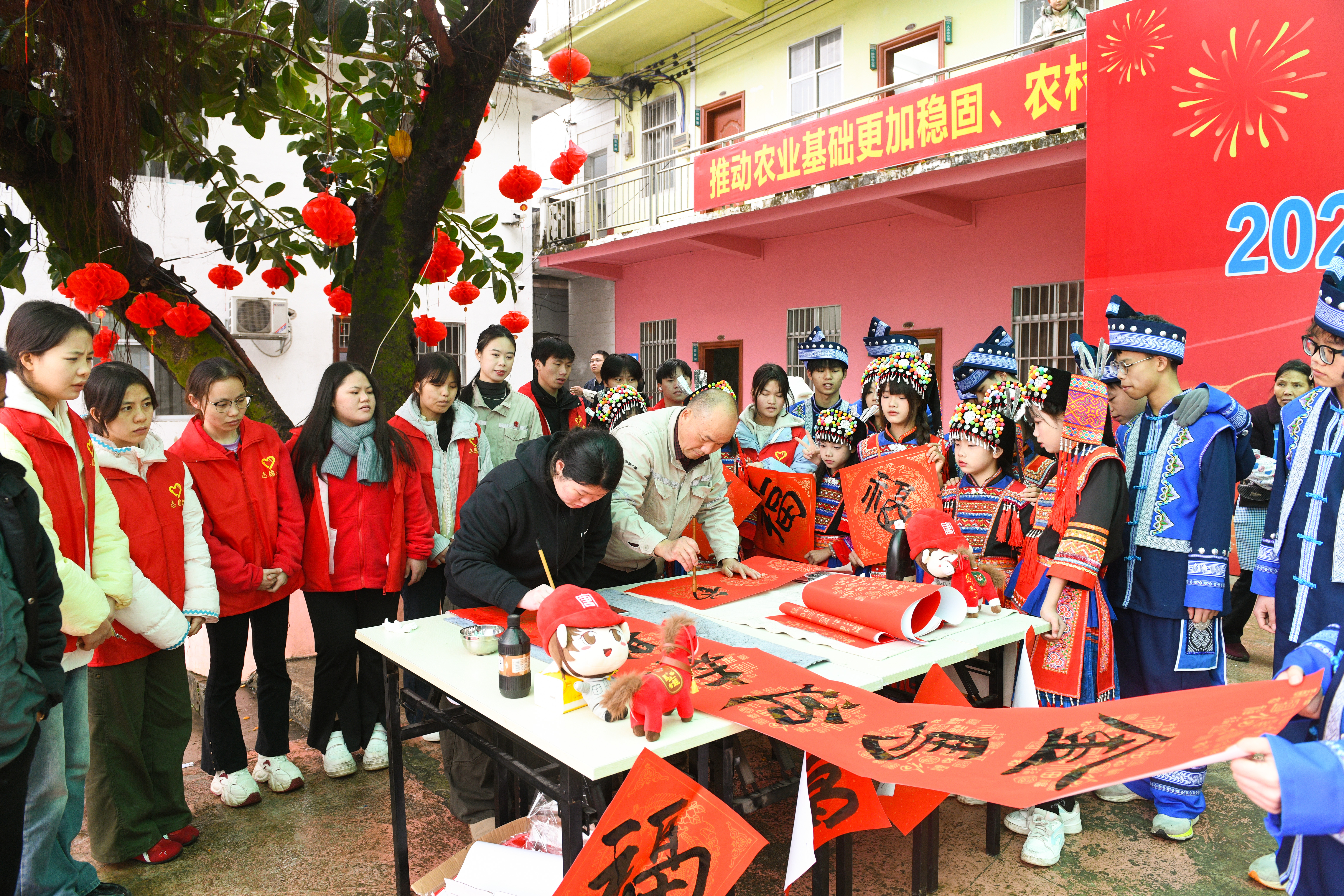 “大唐織錦鋪富強,板蘭鳴琴奏和音”,橫批“錦繡前程”——墨跡未干,已引來一片喝彩。在板蘭村古榕樹下,來自后盾單位大化總廠的職工與板蘭村書法愛好者一同揮毫,紅紙翻飛間,一副副寓意吉祥的春聯躍然紙上。